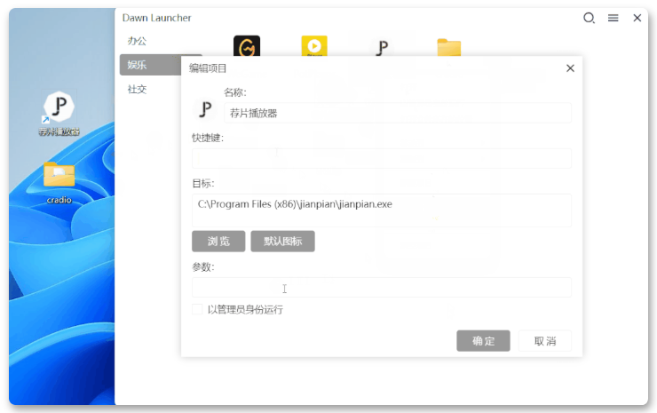 右键点击 Dawn Launcher 左侧栏位置,可以为自己创建一个分类,输入分类名称,名称根据个人喜好来,比如 「办公」、 「娱乐」这些都可以,还能为该分类配置快捷键,使用过程中,键入对应快捷键,可以快速打开分类。